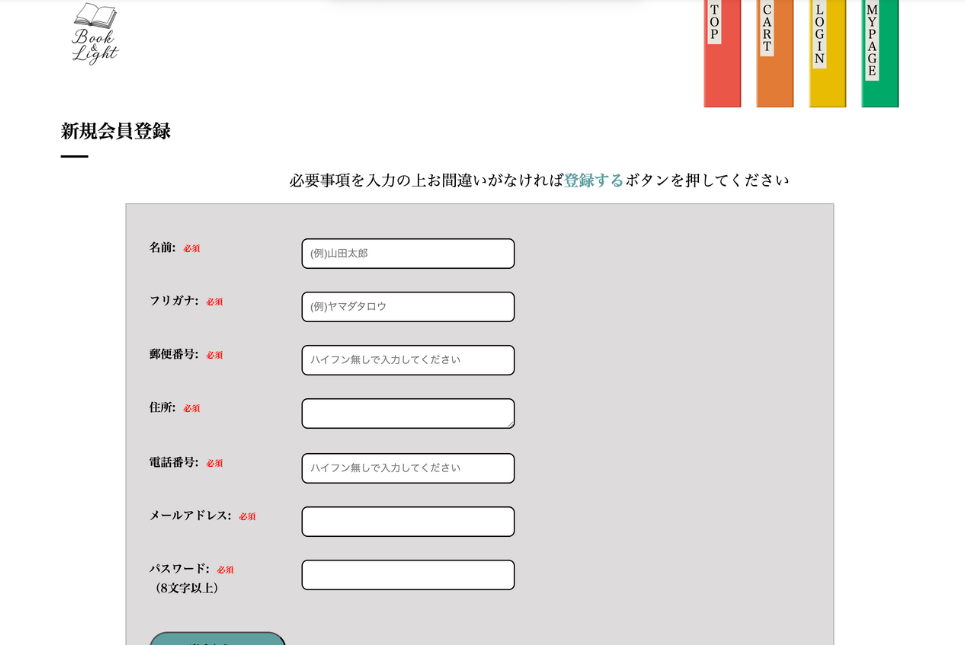 ・会員登録・ログイン・ログアウト・商品検索・カート・購入・お気に入り・レビュー・お問い合わせ