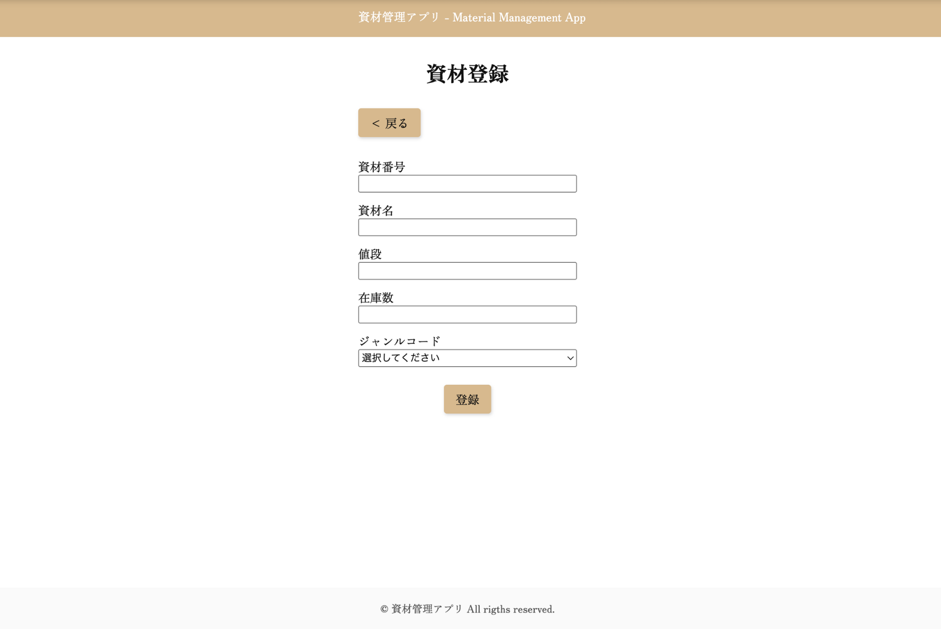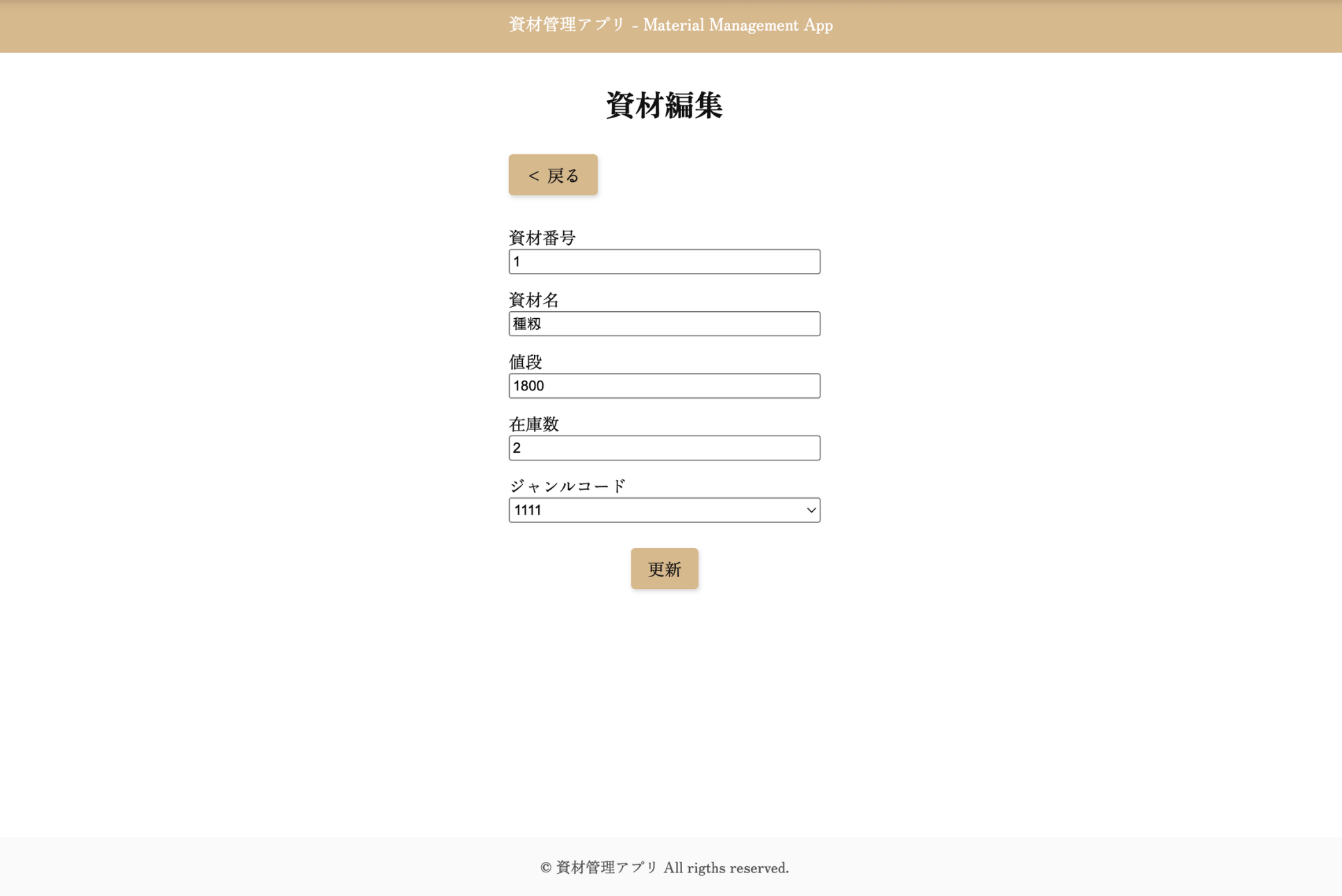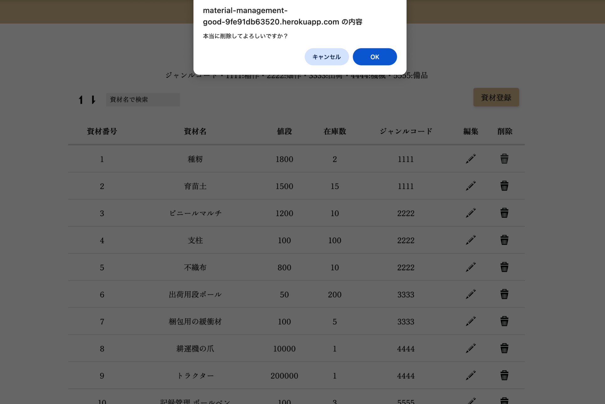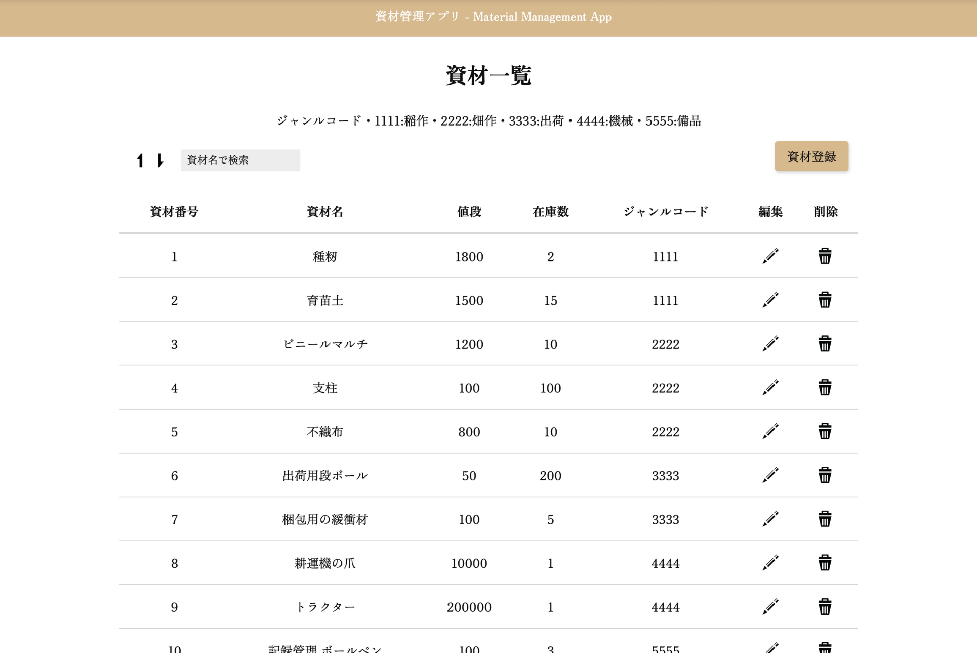 ・CRUD機能・資材番号の昇順・降順に並び替える機能・検索機能