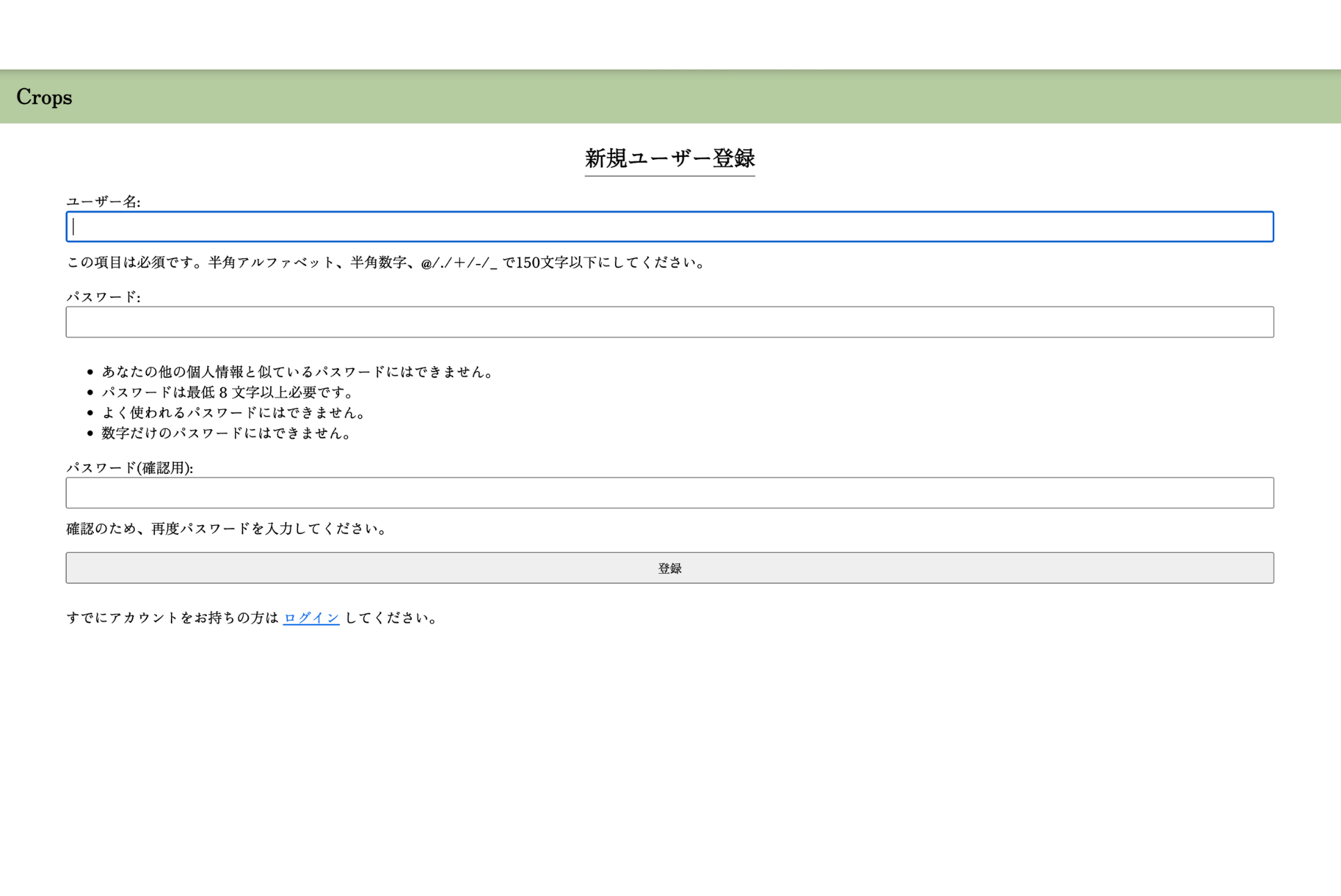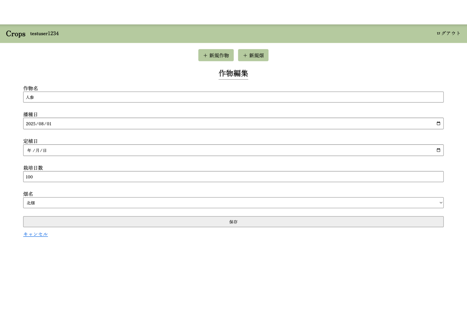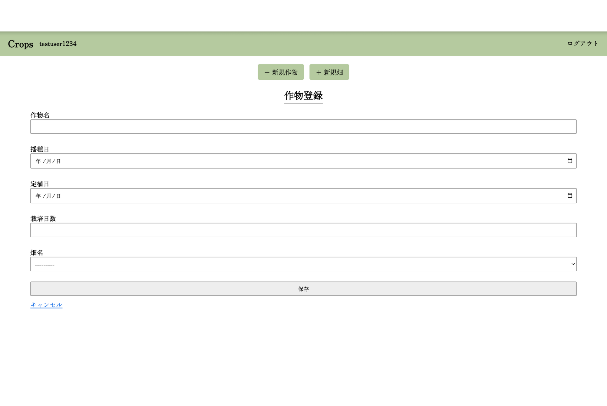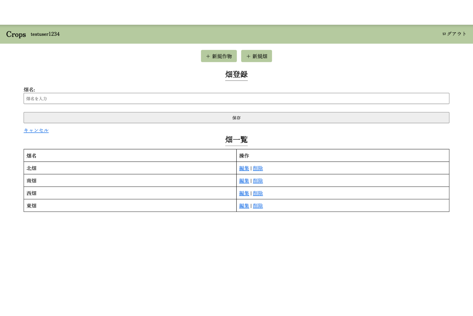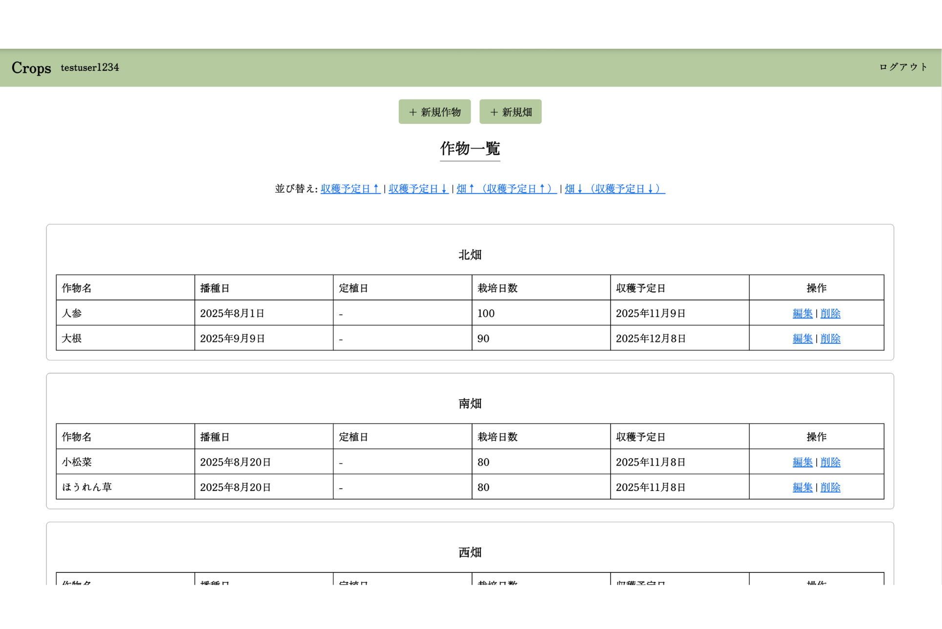 ・CRUD機能・ログインによる個別管理機能・収穫予定日順に表示する機能(全作物又は畑ごと)